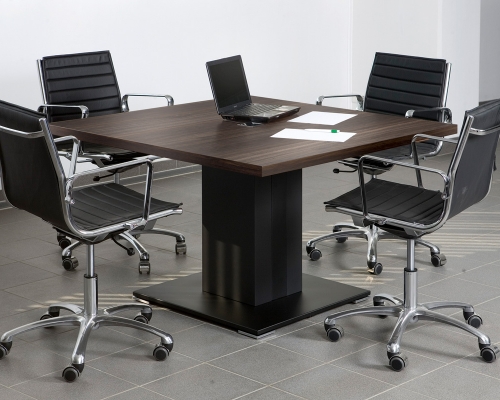 Материал: столешница ДСП 39 мм., покрытие шпон, опоры- тамбурат ДСП 100 мм, черный цвет, встроенный кабель-канал; опорная тумба - ДСП, фасад шпон, передняя панель- ДСП 19 мм, покрытие - шпон.