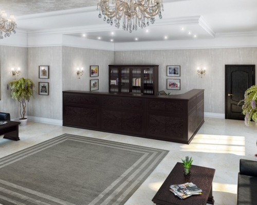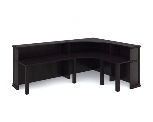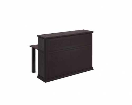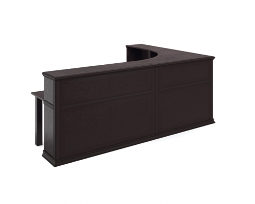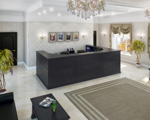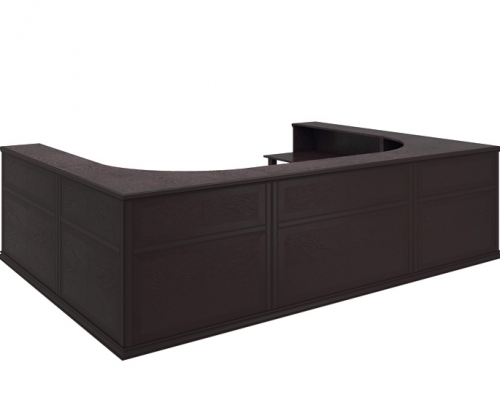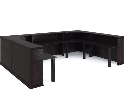 Элегантная и практичная приемная сразу заявит о серьезном статусе компании. Строгий узор на темном фоне панелей выглядит неброско, но дорого. За большой передней панелью возможно размещение двух человек - секретаря и помощника руководителя.
