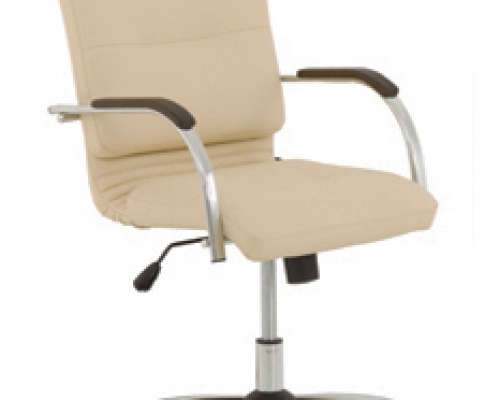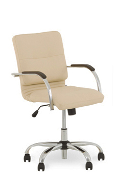 Модель оснащена механизмом качания, нерегулируемыми подлокотниками с накладками из массива дерева и металлической хромированной базой. На нерабочих поверхностях допускается использование искусственной кожи.