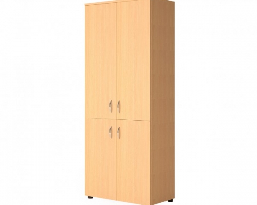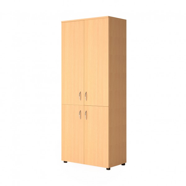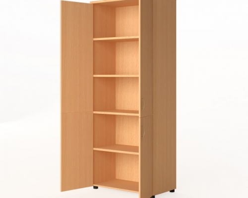 Шкаф имеет глубину 42 см, в нем свободно помещаются папки, альбомы, учебники, тетради, методички. Шкаф состоит из двух отсеков, которые закрываются дверцами: первый ― на две полки, второй ― на три. Полки, дверцы и каркас изготовлены из ДСП светлого тона. Ручки сделаны из стали, поверхность серебристая. Изделие комплектуется четырьмя резиновыми ножками. Все поверхности легко моются. Материалы абсолютно безопасны для детей.
