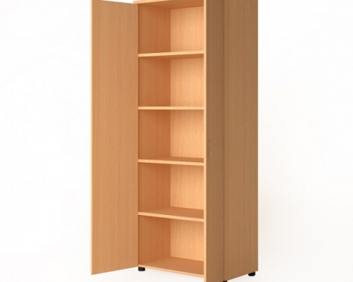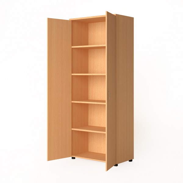 Шкаф изготовлен из ДСП светлых тонов и состоит из пяти полок, которые закрываются двумя большими дверцами на всю высоту шкафа. Дверцы оснащены двумя стальными ручками. Мебель отличается прочностью и надежностью. В производстве используются только безопасные для здоровья материалы.
