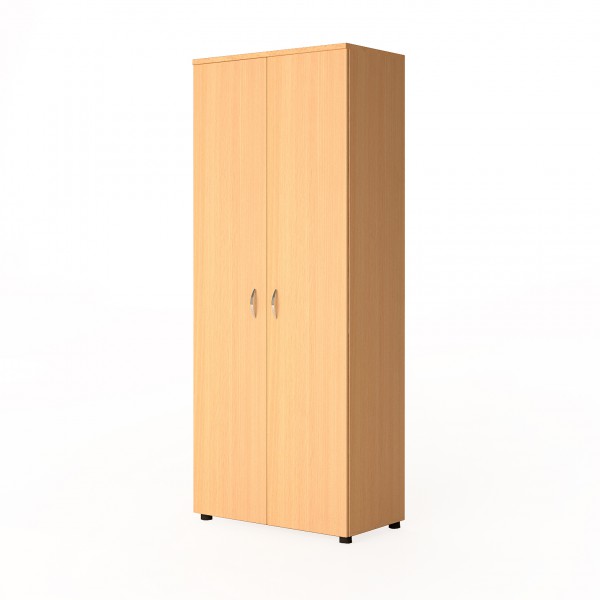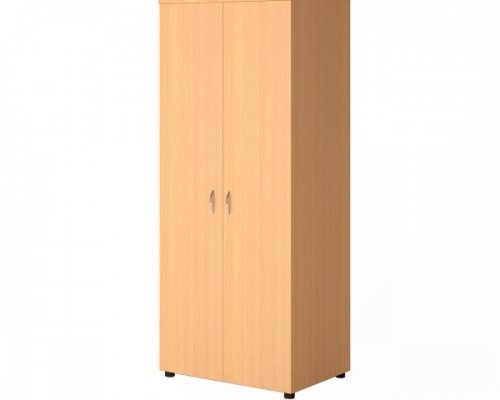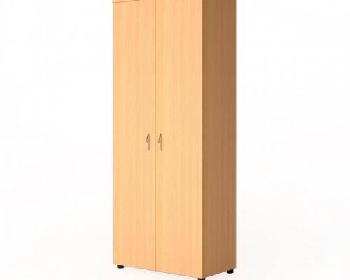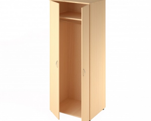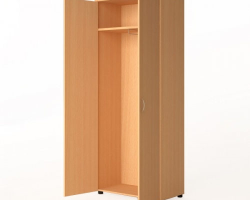 Шкаф для одежды оснащен полкой для хранения головных уборов и выдвижной вешалкой для верхних вещей. Он выполнен в одной стилистике со шкафами для хранения учебных пособий, поэтому станет прекрасным дополнением мебельного комплекта. Изготовлен он из ДСП, устанавливается на резиновые ножки. Каркас шкафа выполнен надежно, поэтому изделие будет служить долгие годы. Он укомплектован двумя стальными ручками.