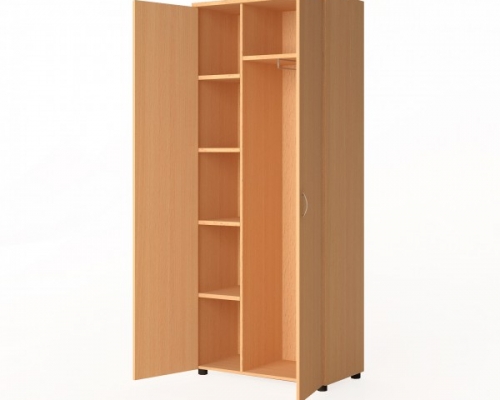 Шкаф состоит из двух секций, закрывающихся «глухими» дверцами. Первая оснащена полками, на которых можно разместить спортивную форму детей. Вторая секция имеет полку для шапок и выдвижную вешалку для верхней одежды. Оснастив таким шкафом школьный класс, можно легко решить вопрос с хранением детских вещей. Изготовлен шкаф из ДСП. Все соединения сделаны надежно и прочно, поэтому изделие прослужит долго.