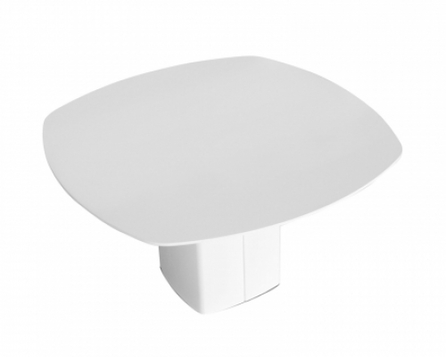 Стол с белой глянцевой лакированной стальной основой и такой же глянцевой белой лакированной столешницей из МДФ, толщиной 30 мм, скошенные края.