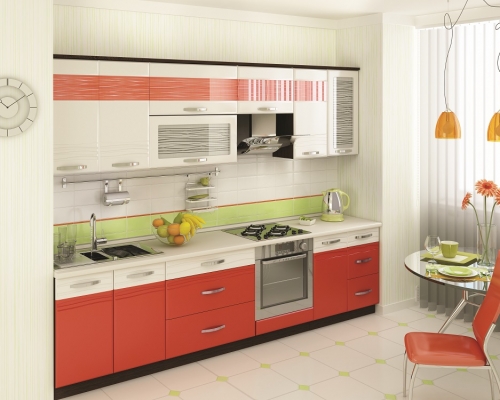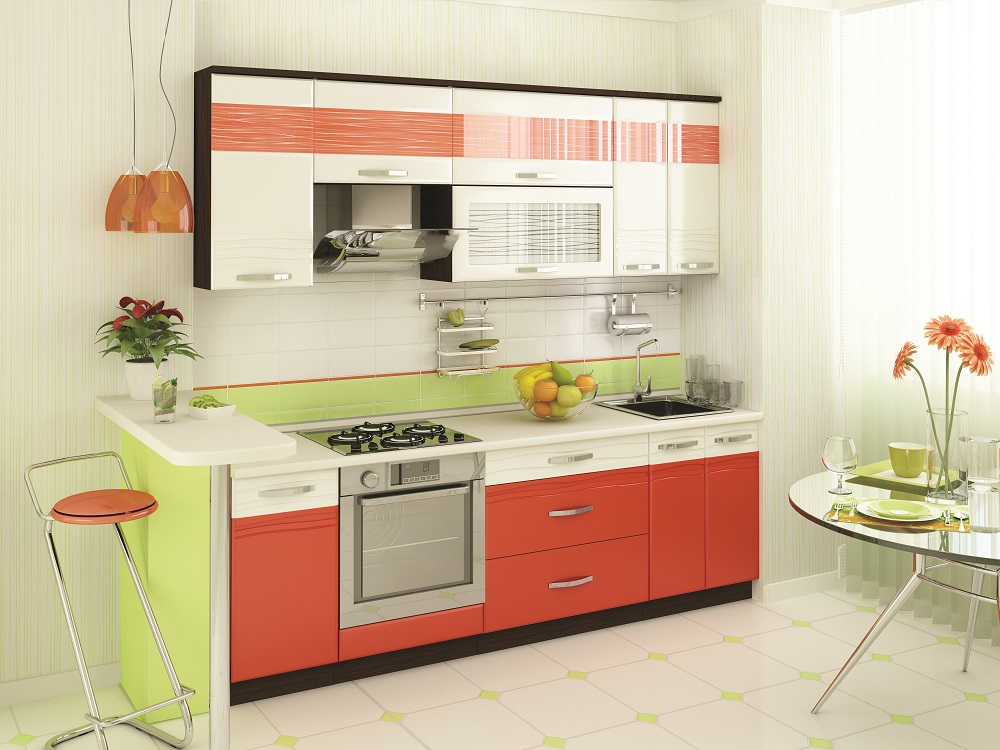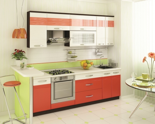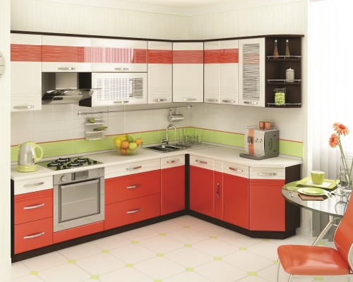 Материал: ЛДСП 16 мм и 22 мм; МДФ 16 мм; Кант ПВХ 0,4 мм и 2 мм; Постформинг 38 мм (в комплект входит плинтус). Цветовое исполнение: цвет корпуса: дуб «Венге»; цвет фасадов шкафов: «Крем-брюле глянец»; цвет фасадов столов: «Оранжевый глянец2» / «Крем-брюле глянец»; цвет постформинга: «Берилл бежевый».