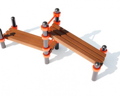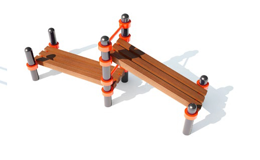 Снаряд состоит из четырех элементов низкая стойка и двух средних стоек, соединенных сварочным способом при помощи перпендикулярных им, шести труб диаметром 25 мм к четырем поверхностям состоящим из бруса 90мм х 90мм, одна из которых параллельна полу, а другая находится под наклоном.