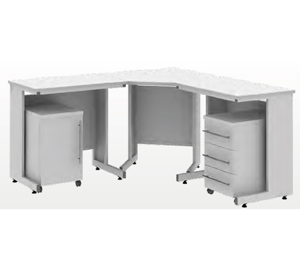 В основе открытого торцевого стола используется стандартный лабораторный стол длиной 1200 мм. Боковые опоры стола на каркасе «С»-образного вида. В основе другого стола, опорная тумба с двумя распашными дверями. Рабочие поверхности трапециевидной формы. Каркасы столов изготовлены из металлической профильной трубы прямоугольного сечения 60х30х2 мм и 30х30х1,5 мм. Нерабочие поверхности изготовлены из металлического холоднокатаного листа толщино 1,5 и 1 мм. Металл покрывается химически стойкой эпоксиполиэфирной порошковой краской. Стол в собранном виде выдерживает статическую нагрузку не менее 200 кг, при условии равномерного распределения нагрузки по рабочей поверхности стола. Ножки столов укомплектованы усиленными винтами регулировки высоты для компенсирования неровностей полов при установке мебели. Рабочая часть опоры стола изготовлена из высокопрочного пластика и позволяет перемещать мебель без повреждения напольного покрытия.