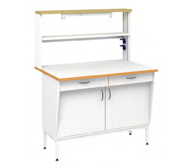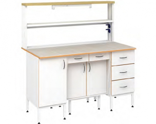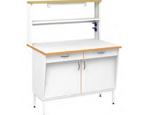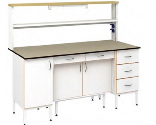 В основе пристенного физического стола 1200 — опорная тумба на металлическом каркасе. На него установлена рабочая поверхность размером 1200х800 мм. На столешницу установлен технологический стеллаж.