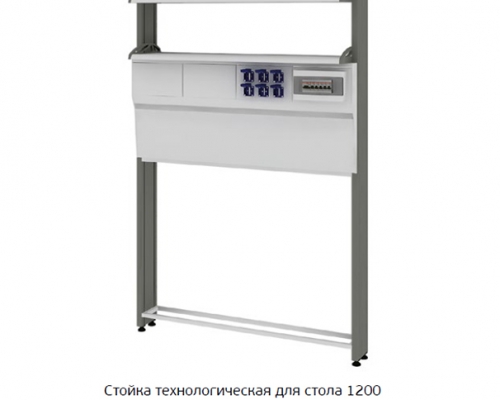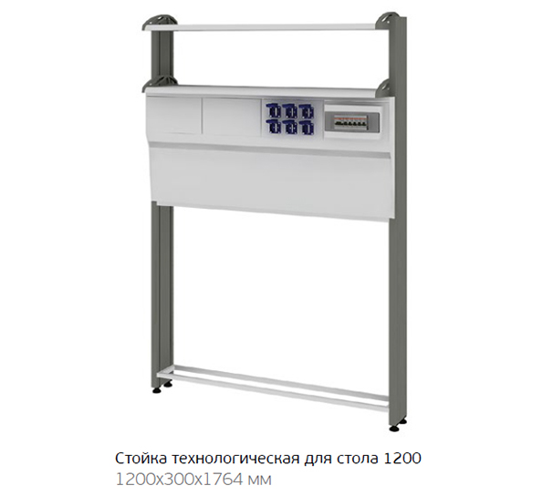 Предназначены для размещения принадлежностей, инструментов, лабораторных приборов, с двумя горизонтальными полками, установленными на две опорные вертикальные стойки. Стойки изготовлены из высококачественного алюминиевого сплава. Под нижней полкой расположена сегментная сервисная панель. Каждый сегмент представляет быстросъемную панель. Панели закрывают доступ к коммуникациям и предназначены для размещения на них различного инженерного оборудования. На одной панели в штатной комплектации стеллажа расположены три пыле влагозащищённые розетки на 220 вольт, закрывающиеся крышками. На другой панели установлен автомат аварийного отключения питания 16 А. лабораторной посуды.