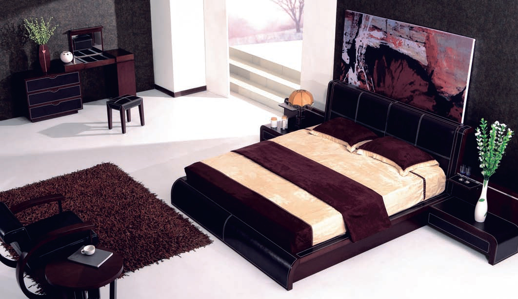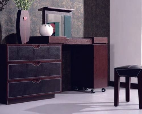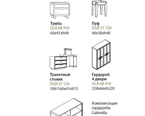 Gabriella – cочетание дерева и кожи, строгости и функциональности. Преимущества спальни – вместительный ящик для хранения спальных принадлежностей, эргономичный туалетный столик и бокс для украшений. Кровать комплектуется тумбами.