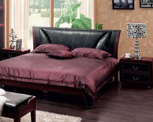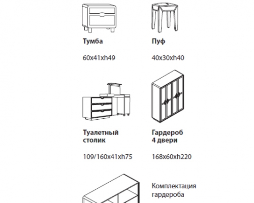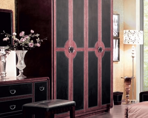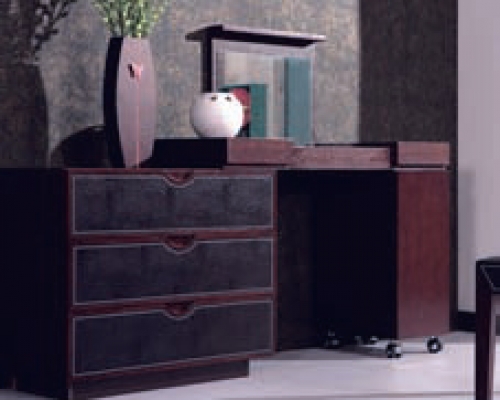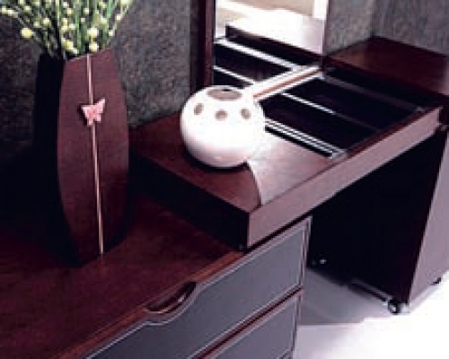 Gelia – стильное сочетание шпона венге и темной кожи, изысканный и строгий дизайн. Спальня комплектуется туалетным столиком и пуфом.