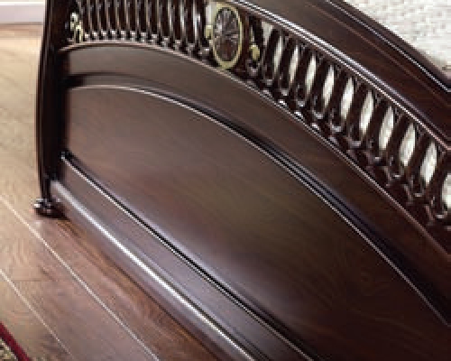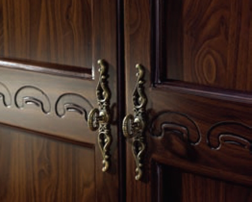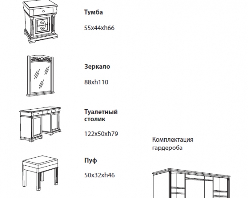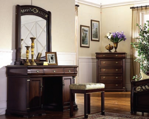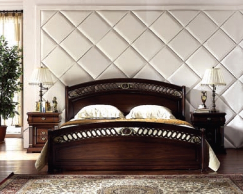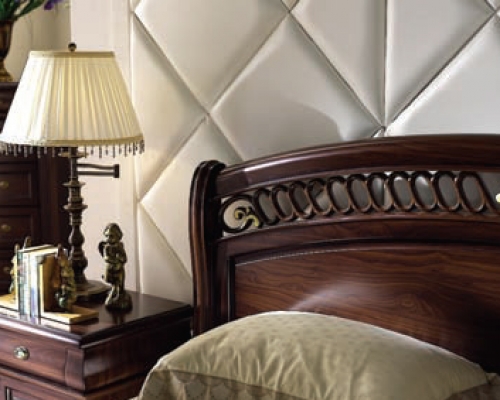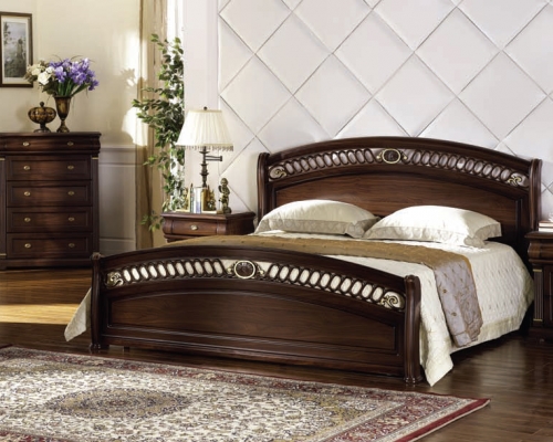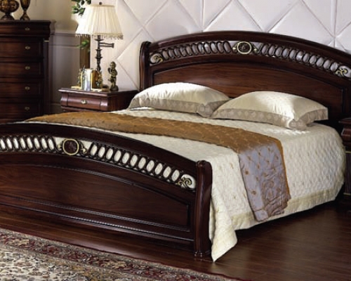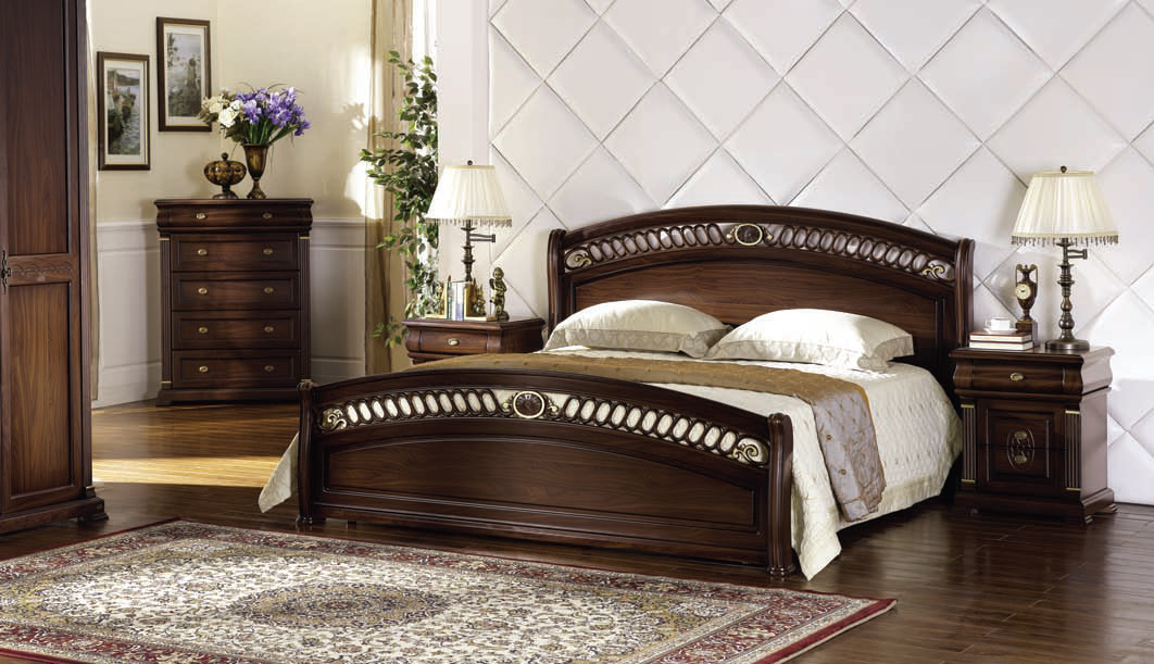 Olivia – текстурированное покрытие в цвете темный орех смотрится особенно эффектно, а позолота и растительный орнамент декоративных элементов добавляют мягкость классическим формам. Отличительная особенность комплекта – 4-х дверный гардероб с двумя зеркальными дверями.