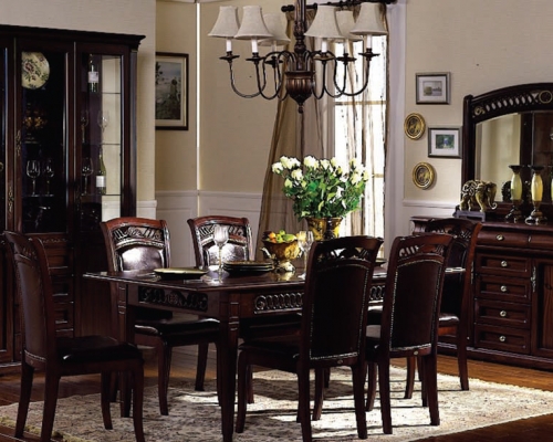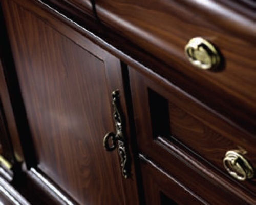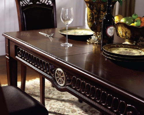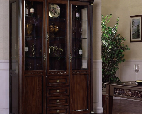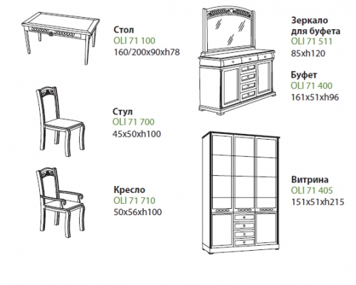 В классический дизайн гостиной Olivia добавляет мягкости позолота и растительный орнамент декоративных элементов. Особенно эффектно декор сочетается с текстурированным деревянным покрытием в цвете темный орех. Стол, стулья и кресла – массив гевеи, мягкие части стульев обиты переработанной кожей коричневого цвета.