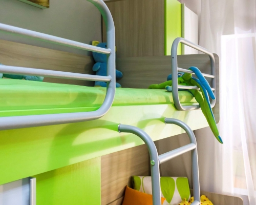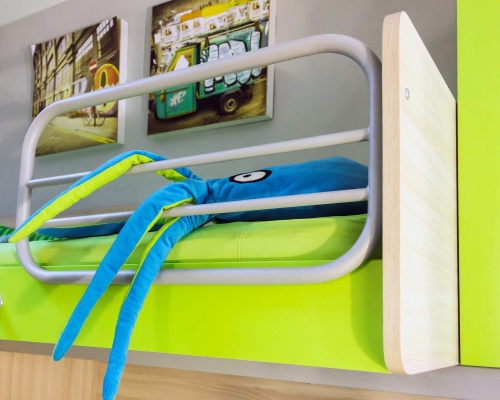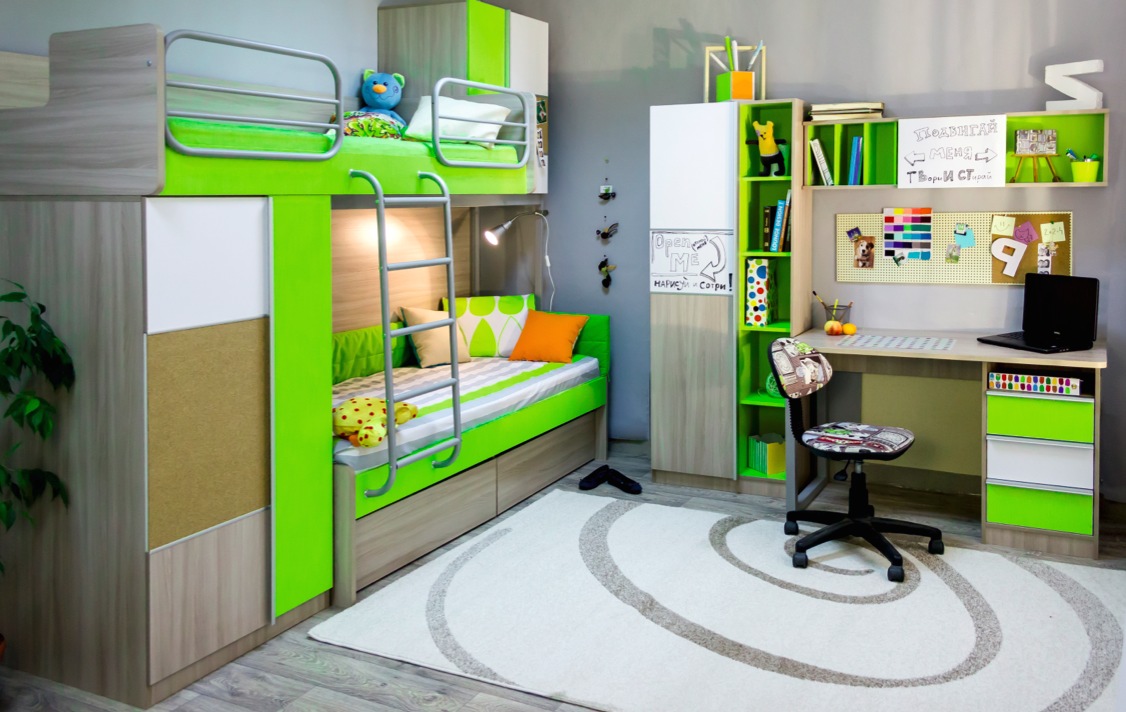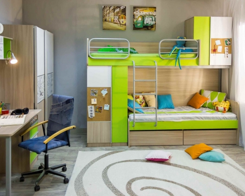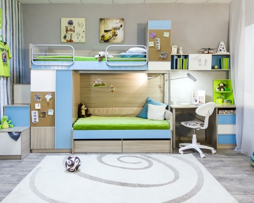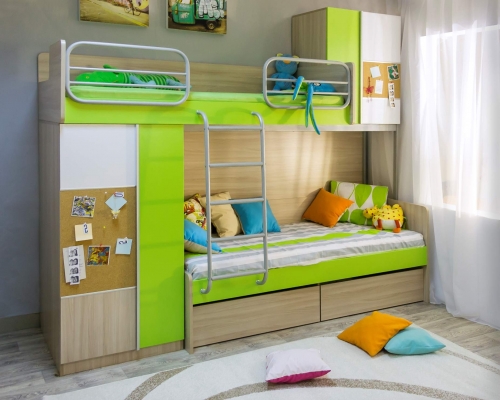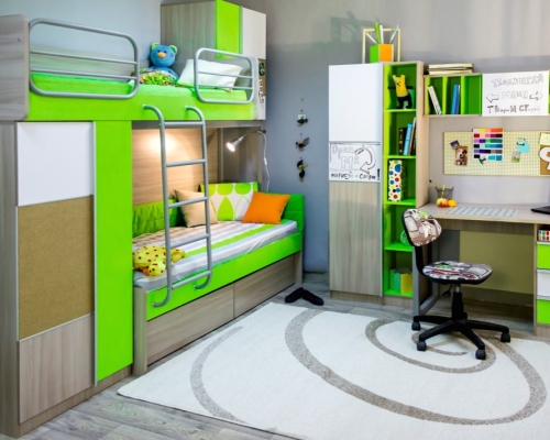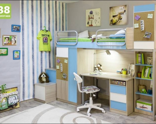 Все это, а также двухуровневая кровать, которую так любят все дети, полка интересного дизайна, натуральная и позитивная расцветка мебели превратят детскую в излюбленное место для игр и творчества.