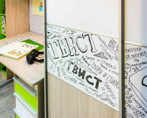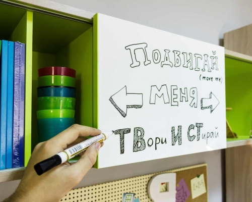 Изюминка коллекции - это двусторонние вставки на фасадах: с одной стороны пробковое покрытие, с другой - белая доска для рисования whiteboard-маркерами, где дети с удовольствием оставят свои заметки.