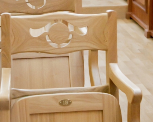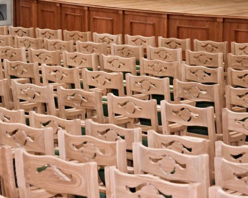 Разработкой этой модели занимались профессиональные резчики по дереву. Для этой модели, мы используем при изготовлении только твердолиственные породы дерева - ясень или бук, поскольку в светлом тоне данная модель смотрится наиболее гармонично. Исключается обивка сиденья экокожей – мы не используем материалы, которые выбиваются из стилистики модели. Дополнительные изящества креслу придает и резная спинка, узор которой отсылает нас еще к античности. Минимализм – необходимое условие подобных интерьеров, чтобы ничто не отвлекало от происходящего на сцене. На такое стуле очень комфортно выдержать длительное выступление, при этом сохранив изящество и осанку.
