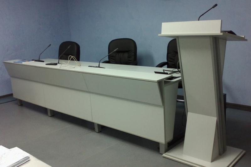 Современное производство столов для президиума и трибун для выступления позволяет решить многие технические задачи. В столы могут быть встроены мониторы-суфлёры, позволяющие оратору читать текст не с бумажного носителя, а с монитора. Как правило все столы и трибуны давно оснащаются встроенными микрофонами, а в случае необходимости подсветкой. При проектировании такой мебели для заседаний, необходимо понимать, что она как правило стационарная, но в случае необходимости можно предусмотреть скрытые разъёмы позволяющие убирать со сцены как стол президиума, так и трибуну.